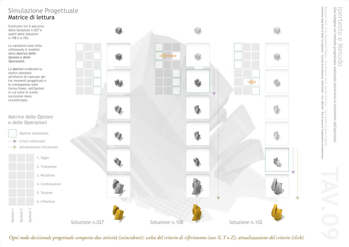 Ad ogni step vengono applicati sempre gli stessi criteri e parametri. L'attualizzazione di una delle 729 soluzioni presentate sarà, pertanto, il frutto della combinazione delle scelte effettuate dall'utente. Si delinea una Matrice delle Opzioni e delle Operazioni (3x6), rappresentazione (discretizzata) del flusso decisionale del progetto (continuo). Ogni soluzione può essere letta utilizzando il modello della Matrice, in quanto descritta dalla combinazione degli elementi della matrice stessa.
